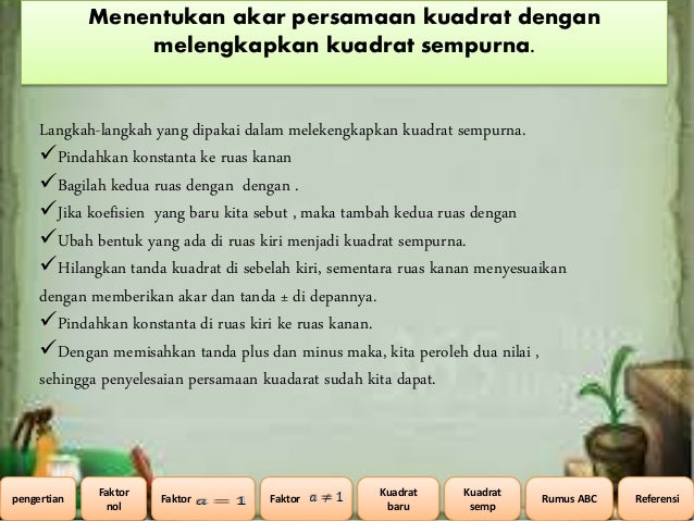 03 Persamaan Kuadrat Present By Sugiyono Ppt Download from slideplayer.info More persamaan kuadrat interactive worksheets. Please copy and paste this embed script to where you want to embed. Persamaan kuadrat adalah salah satu persamaan dalam rumus matematika dan memiliki variabel dengan pangkat yang tertinggi sehingga kuadrat akan dihasilkan dengan bilangan yang sama. Dari komponen yang sudah diberikan, apakah kalian sudah dapat memahami materi mengenai pemfaktoran bentuk aljabar khususnya persamaan kuadrat??? Text of ppt persamaan kuadrat. Menentukan akar persamaan dengan melengkapi kuadrat sempurna. Kevin marpaung persamaan dan fungsi kuadrat bentuk umum persamaan kuadrat adalah : Pemfaktoran melengkapkan kuadrat sempurna menggunakan.