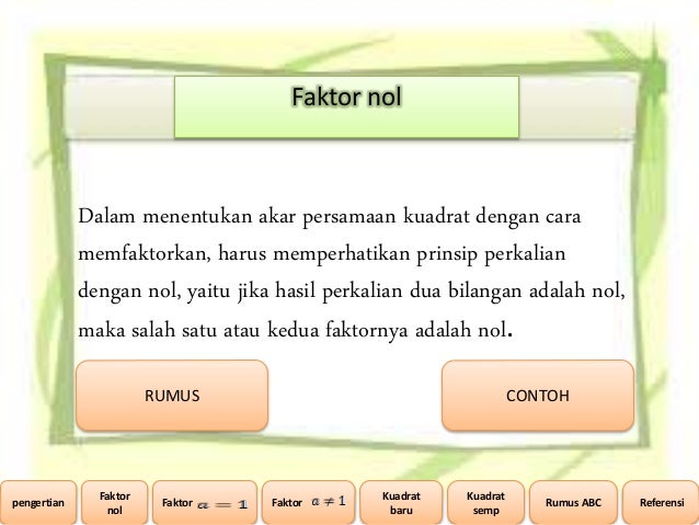 Memfaktorkan persamaan kuadrat jika bisa. Bahan ajar persamaan kuadrat smp.ppt. Persamaan kuadrat dan fungsi persamaan kuadrat. Persamaan kuadrat dapat dipahami sebagai bentuk polinomial dengan pangkat tertinggi 2. Persamaan kuadrat didefinisikan sebagai kalimat terbuka yang menyatakan hubungan sama bentuk umum persamaan kuadrat adalah ax2 + bx + c = 0 dengan a, b, c bilangan riil dan a 0.